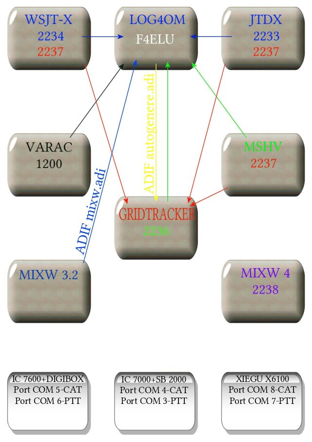 Lors du démarrage de LOG4OM le logiciel démarre automatiquement MIXW 3.2 - WSJT X - JTDX - MSVH - GRIDTRACKER - VARAC, possible de démarrer en plus FLDIGI - MIXW4 ou autres. C'est pratique et le truc sympa c'est qu'il y a moyen de faire communiquer les logiciels les uns avec les autres pour une automatisation de l'enregistrement des contacts radios. Pour info j'utilise 3 émetteurs simultanément en FT8 (émission synchronisée soit à 0 et 30s ou à 15 et 45s). Cette configuration des Ports UDP me permet de m'amuser...... J'utilise OMNIRIG 1.2 avec en RIG-1 IC 7600 et RIG-2 IC 7000 ADIF log mixw.adi automatiquement surveillé par LOG4OM pour une mise à jour éventuelle de la base de donnée du Log, mais créé manuellement avec MIXW 3.2. ADIF autogenere.adi généré automatiquement par LOG4OM que GRIDTRACKER surveille en live et au démarrage du logiciel. MIXW 4 doit pouvoir communiquer avec LOG4OM, en cours de test, mais ne sera surement pas utilisé car je préfère MIXW 3.2